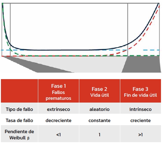 Durante la fase intermedia, la tasa de falla suele ser relativamente baja y estable. En la fase final, el desgaste acumulado provoca un aumento en la probabilidad de falla.