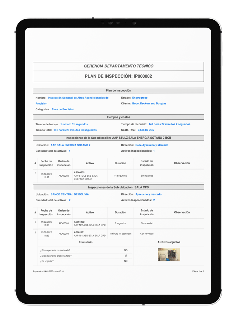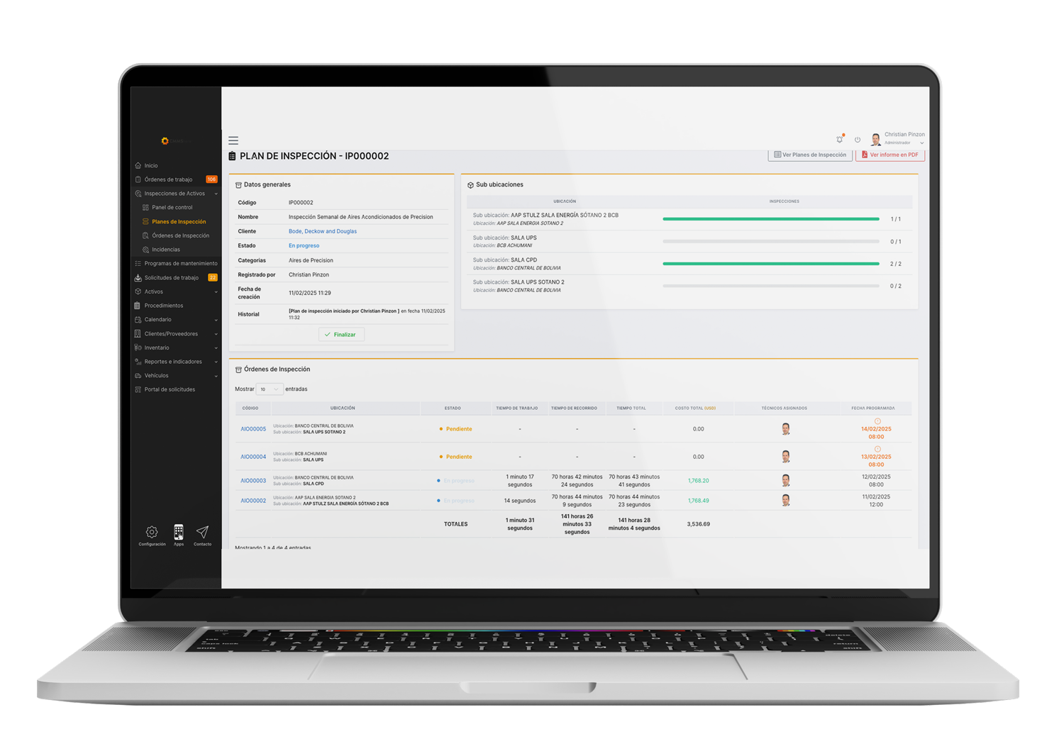 Los reportes y métricas de desempeño se generan al instante, permitiéndote tomar decisiones informadas para optimizar recursos, disminuir mantenimientos correctivos y garantizar la continuidad operativa.